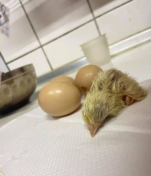 ▼原PO在臉書社團貼文表示,天氣也太熱,讓岳母拿回家的土雞蛋竟自行「蹦出」了一隻小黃雞,原PO岳父早上將這隻小雞帶回去給養雞朋友,並表示經過這次後,以後吃蛋都要先用手電筒照了,「會有陰影」。