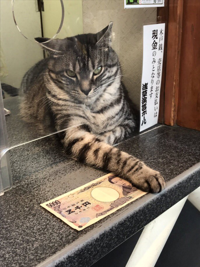2020年07月28日日本的淺草演藝廳有一位眾所皆知的「隱藏版」的售票員,那就是黑灰色的虎斑紋喵喵Girori(ジロリ),想跟Girori買票還得看運氣,因為慵懶是貓咪的特權。看到一臉「奧嘟嘟」的Girori懶懶的用喵肉掌從售票口推出入場券,像是在心不甘情不願的說:「給你啦!」的景象,簡直是萌翻一眾貓奴,讓網友們大呼:「看我還不去買翻!」