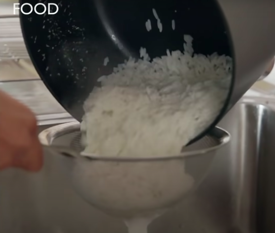 ▼她還拿出濾網,將白米和水分開,又將白米放在水龍頭下沖冷水後瀝乾,是當做在煮義大利麵膩?