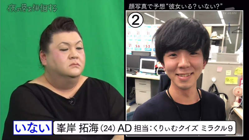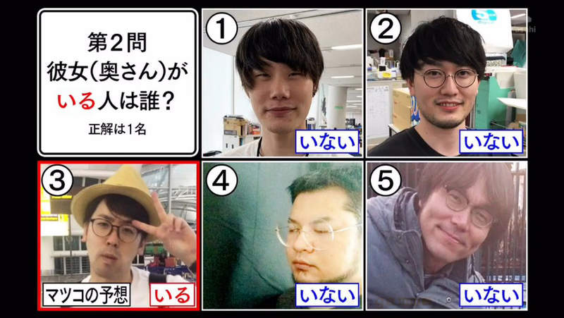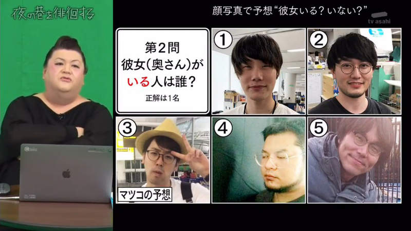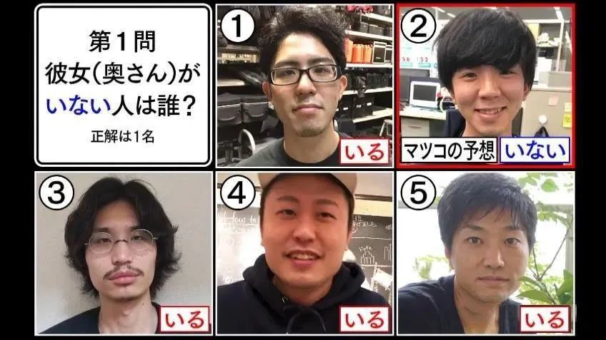 2020年07月29日你能從一個人的「面相」來判斷出他有沒有對象嗎?日本知名的綜藝節目主持人松子DELUXE主持朝日電視台播出的《夜の巷を徘徊する》節目,在7月17日播出的節目裡,節目組安排讓松子從「正面照」,來判斷一個人是不是有另一半,共有兩題,大家也來試試看自己猜不猜得準吧~