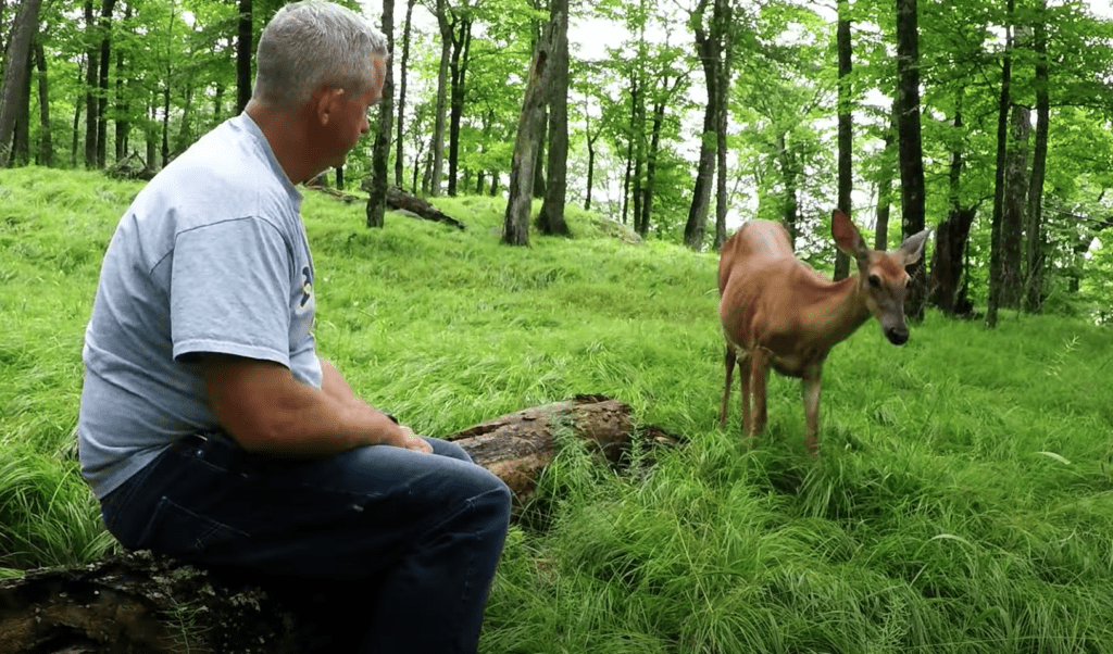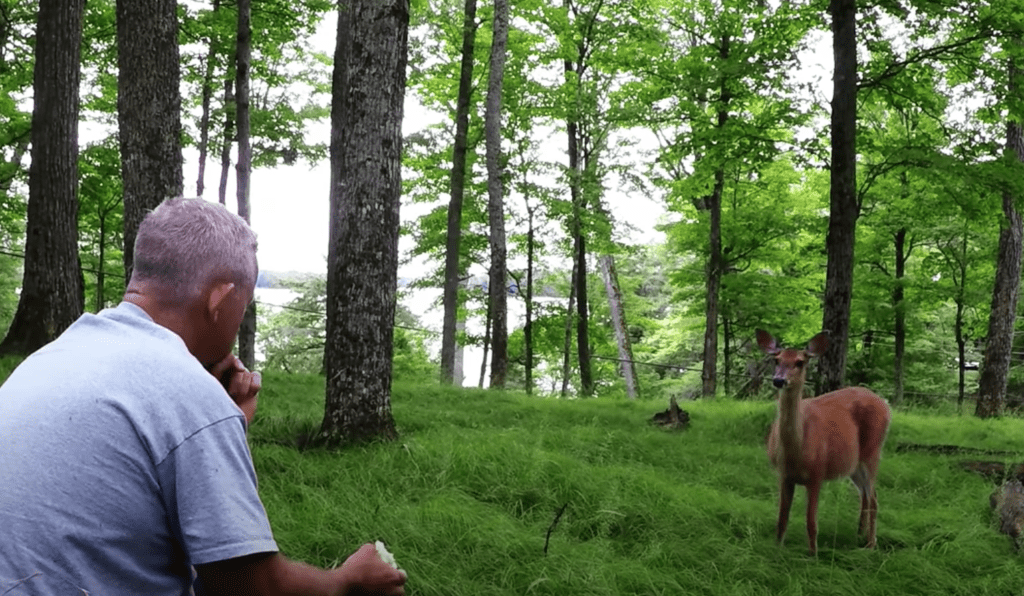2020年07月30日加拿大安大略省南部有一片寧靜的森林,因為不允許狩獵,所以生活在這裡的小鹿對人類沒有戒心。一名男子在森林中吃蘋果時引起了小鹿的注意。小鹿跑來討食,他大方跟小鹿們分享,那寧靜、和諧的畫面讓人覺得很療癒。