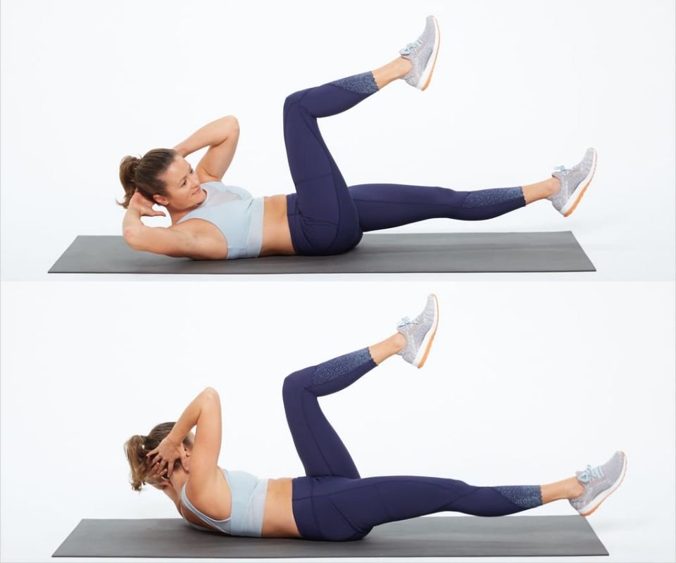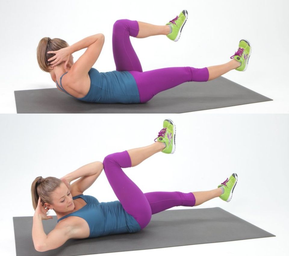 平躺在地面上雙手抱頭,彎曲膝蓋,接著雙腿離地模仿踩腳踏車的動作,腳踩的同時上半身也離地,可以左右手交互往前平衡身體。這個動作除了訓練腹肌以外,對臀部線條的雕塑也很有幫助!強度的部分,一樣採循序漸進的方式加強,第一週每天30下,第二週45下,第三週60下,第四週75下。