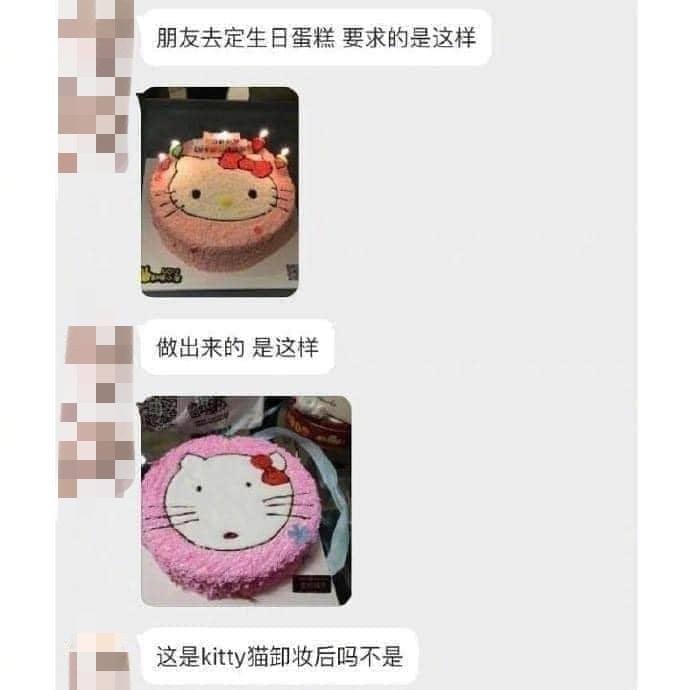 2020年08月10日每次看蛋糕店的廣告,都會被那些造型精美的蛋糕吸引,但實物往往跟廣告不太一樣~最近一位網友在臉書社團分享了一件趣事。原po的朋友在蛋糕店訂了一個生日蛋糕,要求蛋糕師做成粉嫩的Hello Kitty造型,還特別找了示意圖供蛋糕師參考,但最後拿到蛋糕時卻傻眼了…