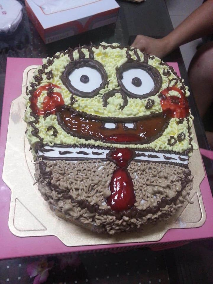 ▼網友們看到後忍不住哈哈大笑,很多人表示自己也遇到過類似的事,紛紛po出自己訂過的那些「差很大的蛋糕」。比如嚇人版本的海綿寶寶: