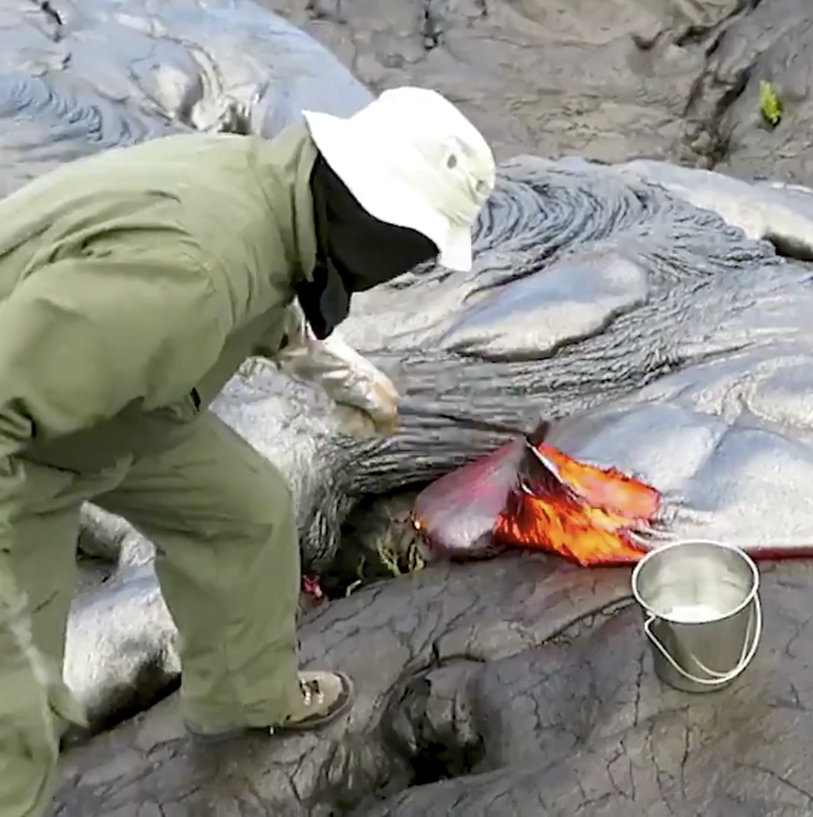 ▼2017年時夏威夷的基拉韋亞火山(Kilauea volcano),美國地質學隊就曾出動去採集岩漿。只見地質學者穿著隔熱裝備,用錘子扒開岩漿黑色的表皮,將裡面的暗紅色高溫黏稠物質丟到水桶裡去。