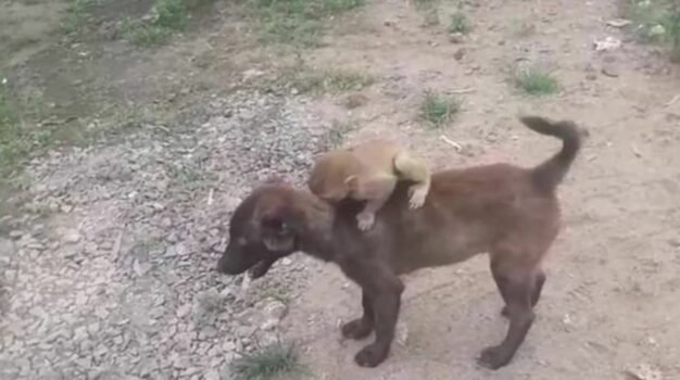 ▼小猴子趴在狗狗的背上,狗狗搖著尾巴往前跑,因為太顛簸,小猴差點滑下去。牠努力抓著狗狗的身體,就像趴在媽媽背上一樣,堅決不放開狗狗。