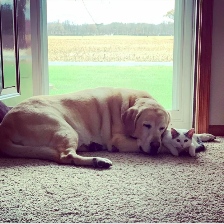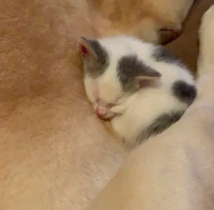 ▼Paxton很喜歡這隻小貓,牠讓貓咪靠在自己的懷裡。在牠的陪伴下,Polly漸漸放下心防,不再喵喵叫,而是安心睡著了。