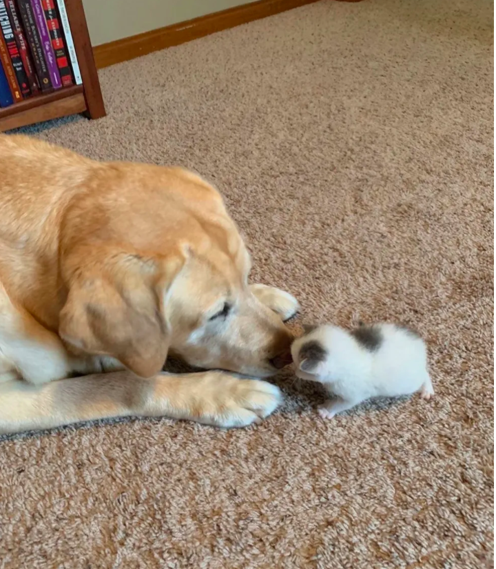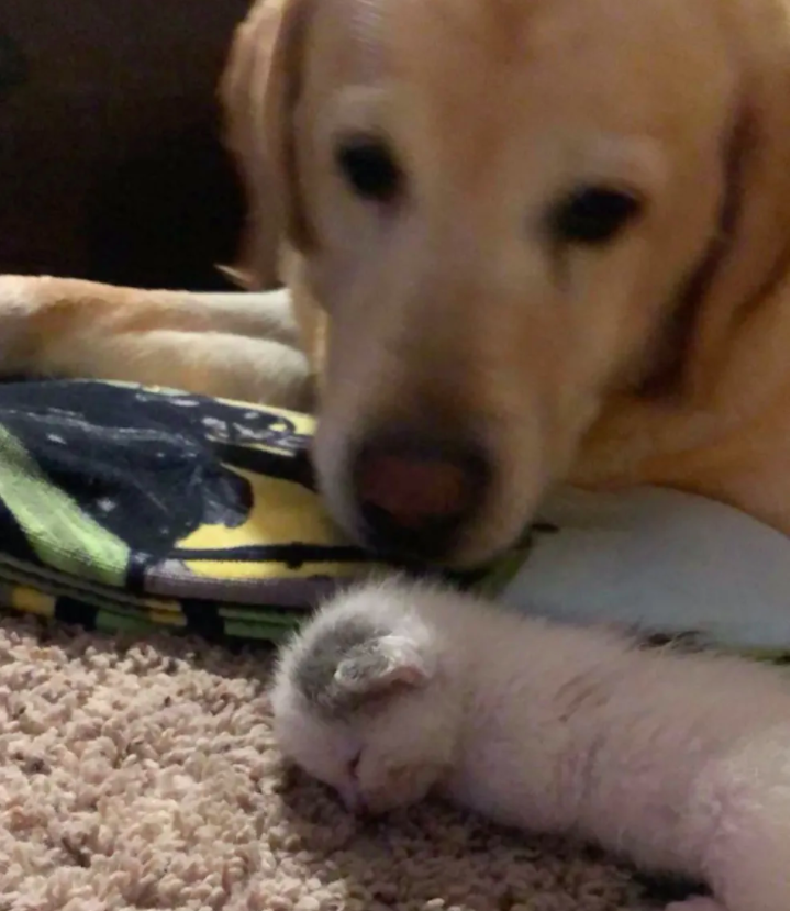 ▼從那天開始,Paxton就將Polly當成自己的小孩來照顧。牠堅決不離開這隻小貓,每次Morgan給小貓餵奶後,牠還會耐心給貓咪舔毛。