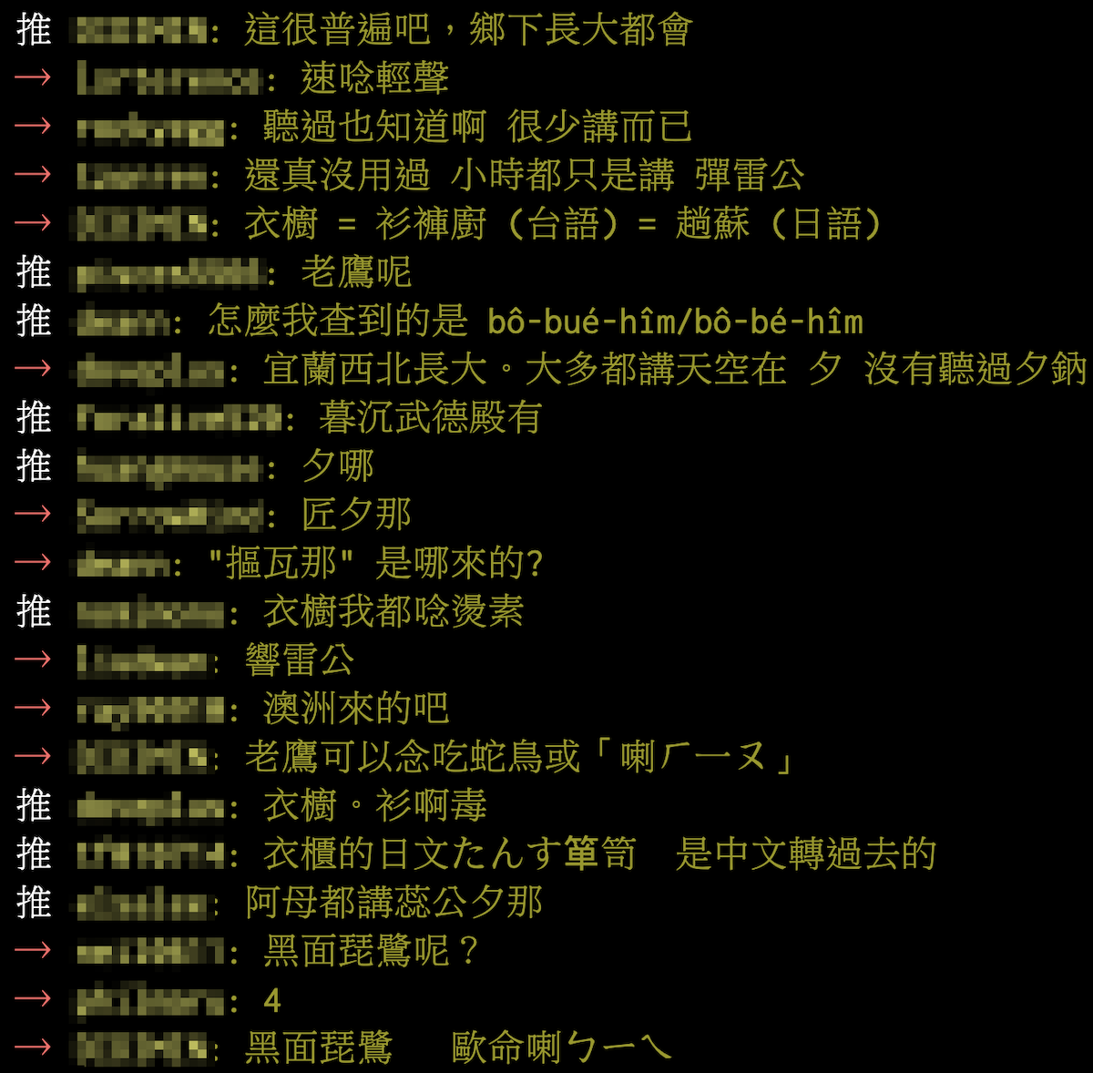 網友看完文章後,紛紛留言回應表示,「只會說單蕊公」、「就連我阿嬤都沒教過我的單字,真的第一次聽到」、「這很普遍吧,鄉下長大都會」、「剛問我媽真是夕娜」、「聽過也知道啊,很少講而已」,也有網友開始討論起其他較特別的台語唸法,「老鷹可以念吃蛇鳥或『喇ㄏㄧㄡ』」、「衣櫥是湯速」、「彩虹不能按照字面翻譯,念作『框(台語)』」。