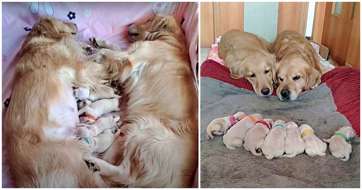 ▼育兒過程中金金把拔一直陪在金金馬麻身邊,這對相愛的夫妻將寶寶們放在中間守。小狗們喝奶時金金把拔也守護在牠們旁邊。