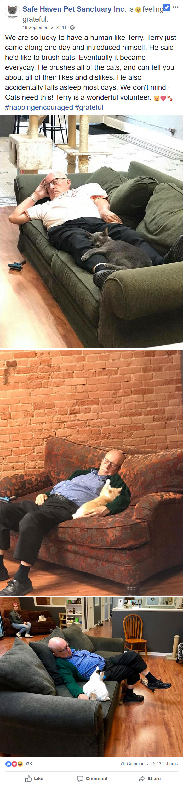 ▼泰瑞自願到收容所當志工,表示自己很喜歡為貓咪梳毛,雖然他經常累得睡過去,可是看得出來貓咪都很喜歡他。