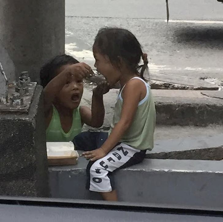 ▼在2016年的12月12日,一對到馬尼拉旅遊的情侶遇見了行討的小男孩,於是給了他一份速食餐點,當時小男孩拿了情侶給的餐點後馬上就迅速離去,這對情侶當下也並不覺得有什麼違和感。但是當這對情侶轉身之後,卻看到了令他們感到驚訝的畫面,原來小男孩拿到餐點後,並不是自己獨享,而是拿到一旁分給自己年紀更小的妹妹吃。