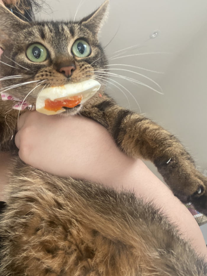 2020年08月19日面對美味的食物,就連高冷的貓咪都把持不住,哪怕肚子飽飽的,也想吃一口嚐一嚐。推主@bbykaat家的貓咪就對食物很感興趣,那天主人剛剛把料理端上桌,牠就迫不及待跳上去叼起雞蛋。牠以為自己的偷吃計畫天衣無縫,沒想到卻被主人當場抓包。