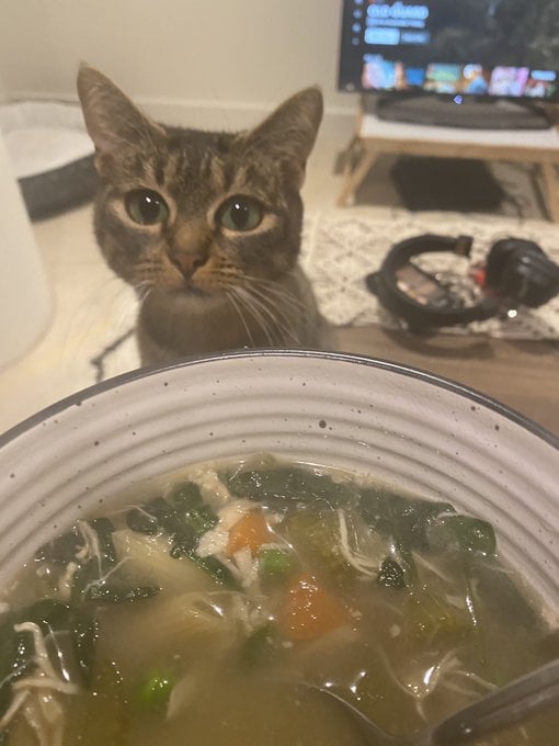 ▼推主無奈表示,她家的貓咪超級愛吃,為了吃到美食連形象都不要了。主人吃飯時牠乖巧趴在旁邊,用水汪汪的大眼睛盯著碗裡的美食,那渴望的模樣讓人忍不住心軟。