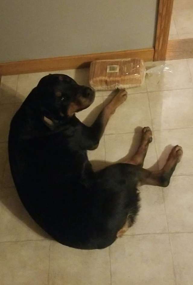 2020年08月19日國外網友Katrina Frank養了一隻叫Jakey的6歲羅威納犬。Jakey有一個很奇怪的習慣,那就是偷藏麵包!只要主人不在家,牠就會把家裡所有的麵包都找出來,然後全都藏起來,並認真守護在旁邊。
