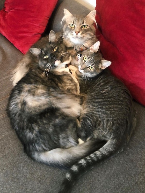 Haley經常將3隻貓咪相處的日常po到社群網站上,網友們都覺得Tortellini非常幸福、非常快樂:「幸好遇到你們」、「家貓:我們想要收小妹,就4牠了」、「貓咪前輩超有愛」、「雖然小貓頭歪歪但是好萌」。3隻貓咪窩在一起的畫面好療癒,牠們雖然不是親兄妹,卻比親兄妹還要親近!