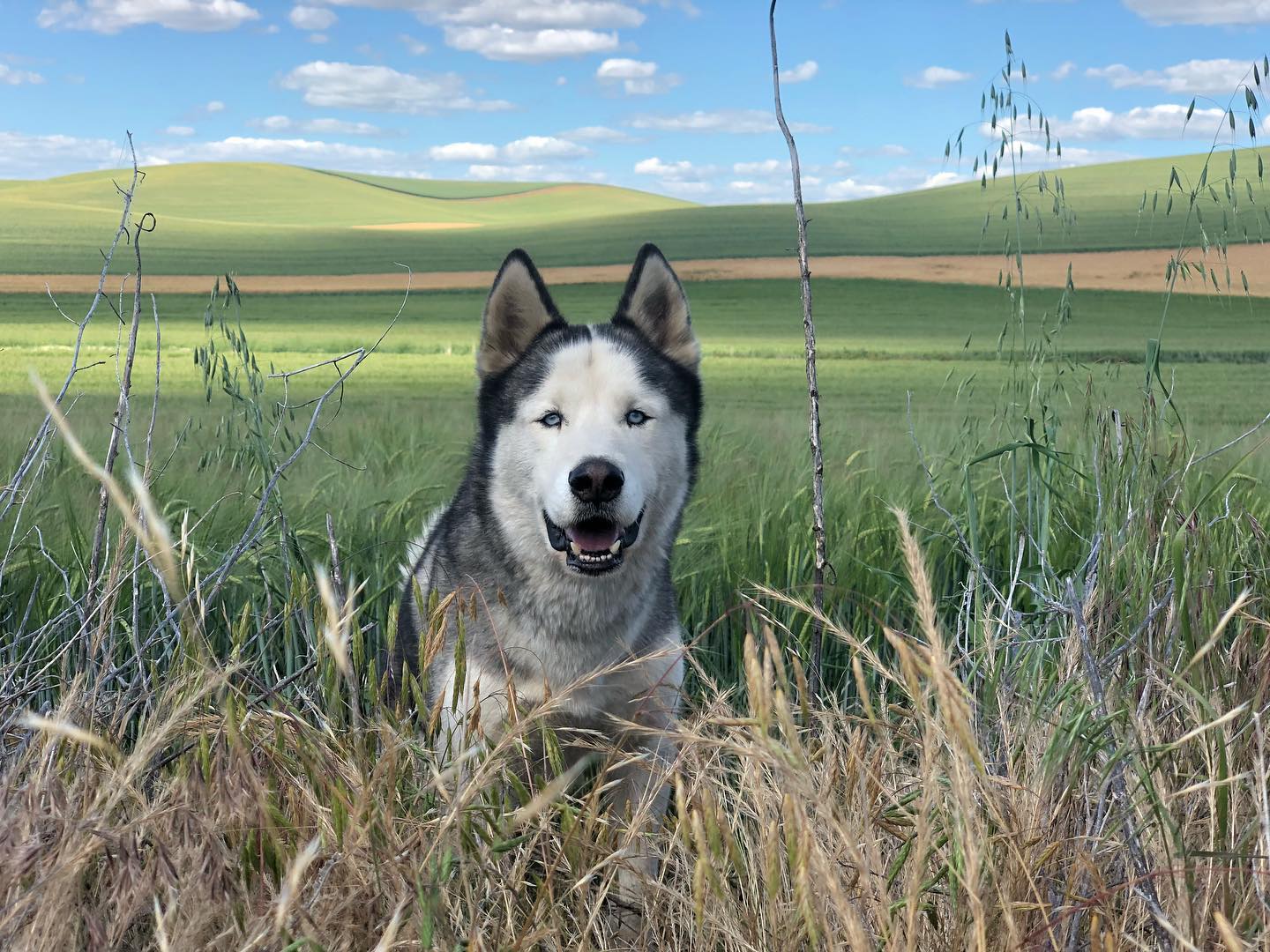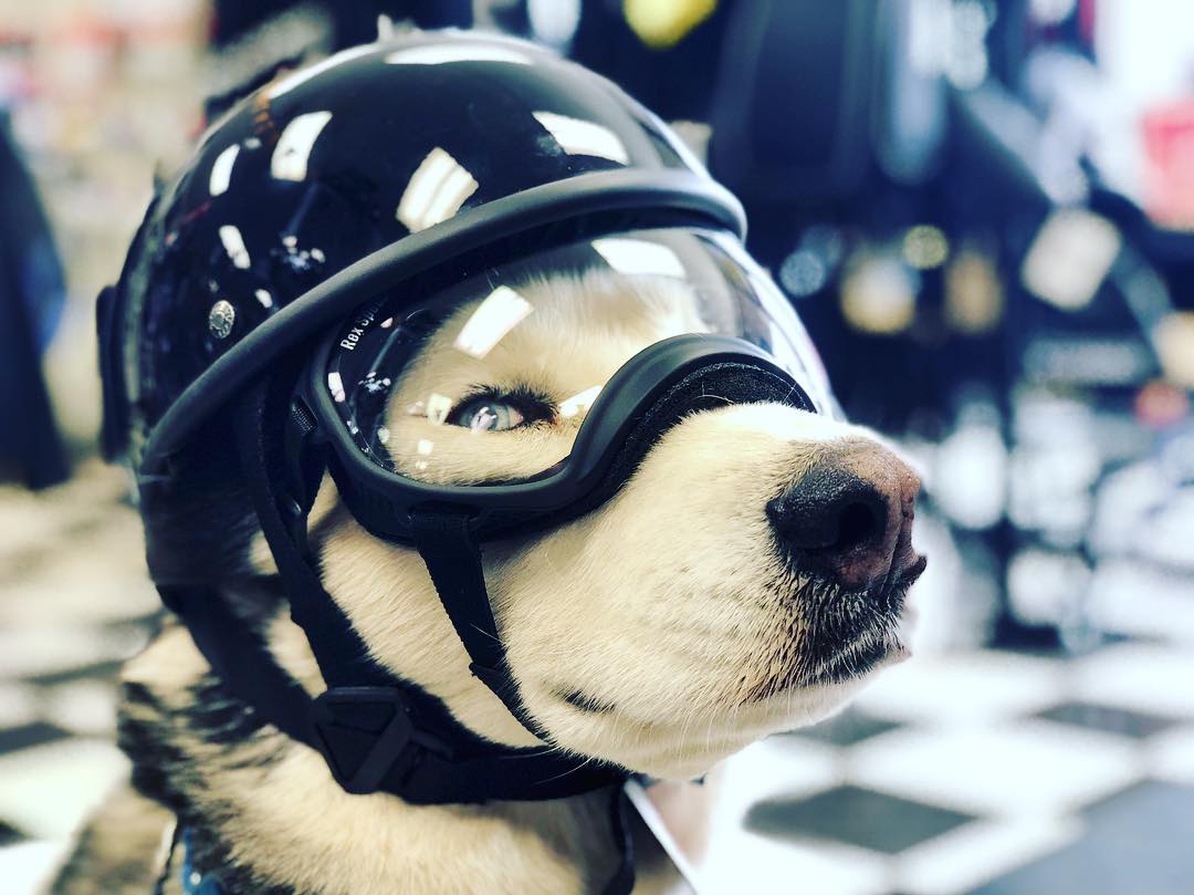 ▼戴上安全帽和護目鏡的Sox是全世界最帥的哈士奇,但摘下來後…牠頭上的毛色有點特別,看起來就像禿頭。