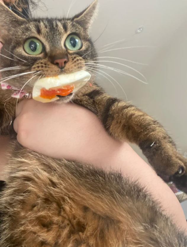 ▼貓咪被抓包時嘴裡還叼著溫泉蛋,牠捨不得把美味的蛋蛋丟下,瞪著大眼睛看向主人,似乎在說:「是溫泉蛋先找我的!我沒有錯!」