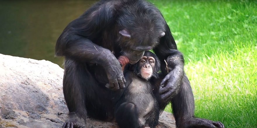 ▼幸好另一隻叫Ava的雌猩猩願意照顧Djibril。Ava沒有當過母親,這也是剛開始工作人員沒有考慮讓牠當養母的原因,但牠天生充滿母愛,對Djibril非常關愛。
