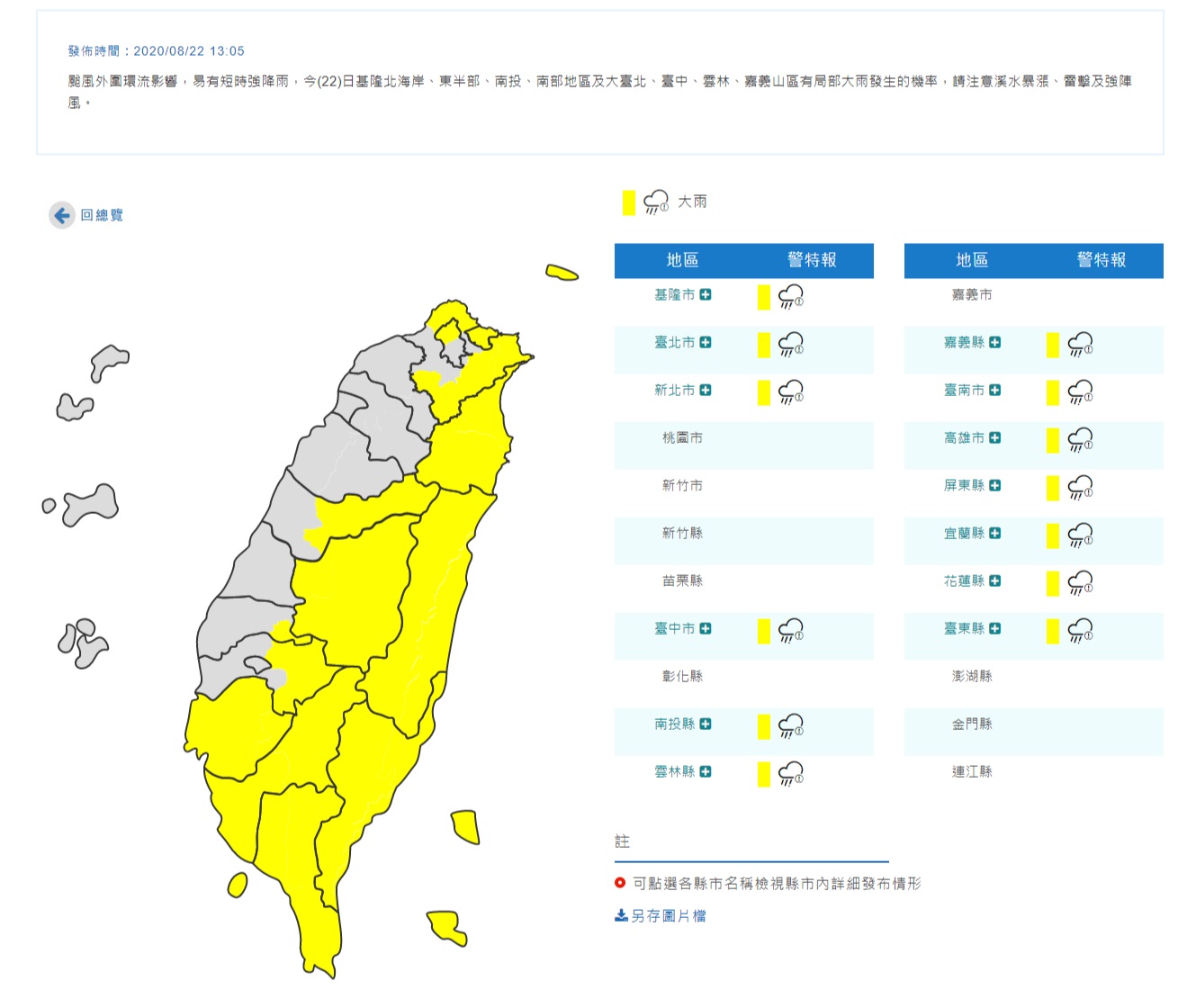 ▼各地降雨強度方面,根據今日中央氣象局發布的大雨特報,此次受颱風影響的主要範圍為台灣北部、中部、東半部、以及台南以南南部地區共計13個縣市,包括:基隆市、台北市、新北市、台中市、南投縣、雲林縣、嘉義縣、台南市、高雄市、屏東縣、宜蘭縣、花蓮縣和台東縣,受到颱風外圍環流影響,易有短時強陣雨發生。