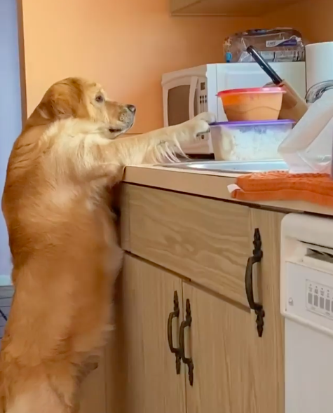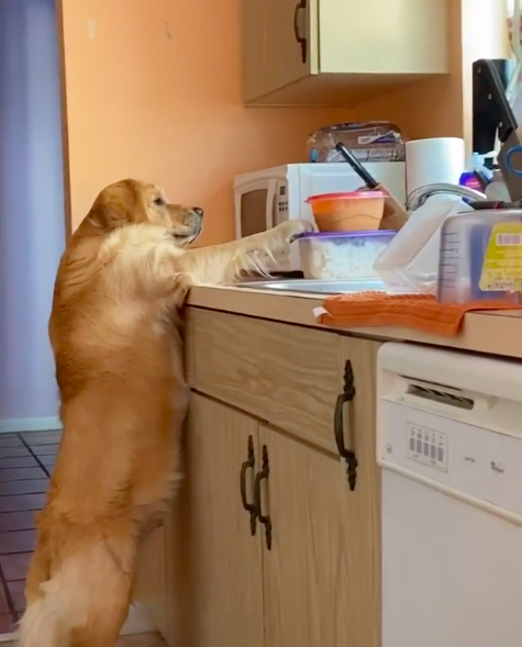▼Luke趁主人不注意跑到廚房,想悄悄吃零食。牠用後腿站立,一隻前爪撐著檯面,另一隻前爪努力去勾裝零食的盒子。