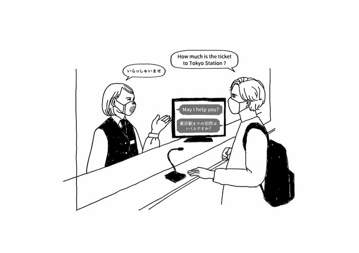 ▼Donut Robotics原本開發的是能擔任東京羽田機場接待員的機器人「肉桂」。肉桂外表可愛,還內建有翻譯功能。COVID-19期間航空旅遊業大受影響,Donut Robotics繼續升級肉桂機器人的計畫也被擾亂了。他們這才決定將開發的翻譯軟體應用在智慧型口罩上。