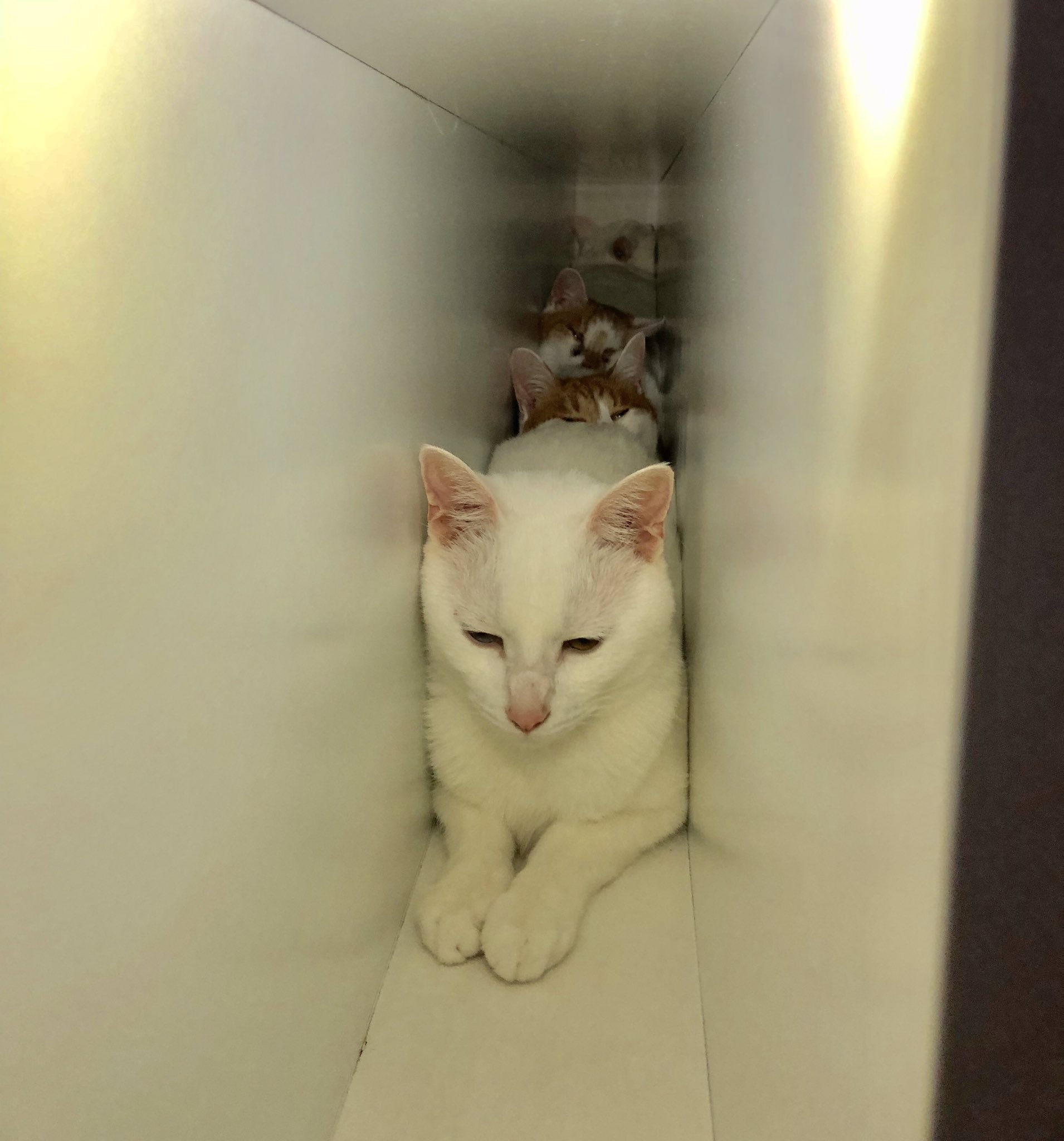 ▼貓咪們一隻擠一隻,最後面那隻連轉頭都沒空間。網友們看到照片後笑說:「當成防空洞嗎」、「也太剛好都躲在一起了吧」、「這什麼概念」。