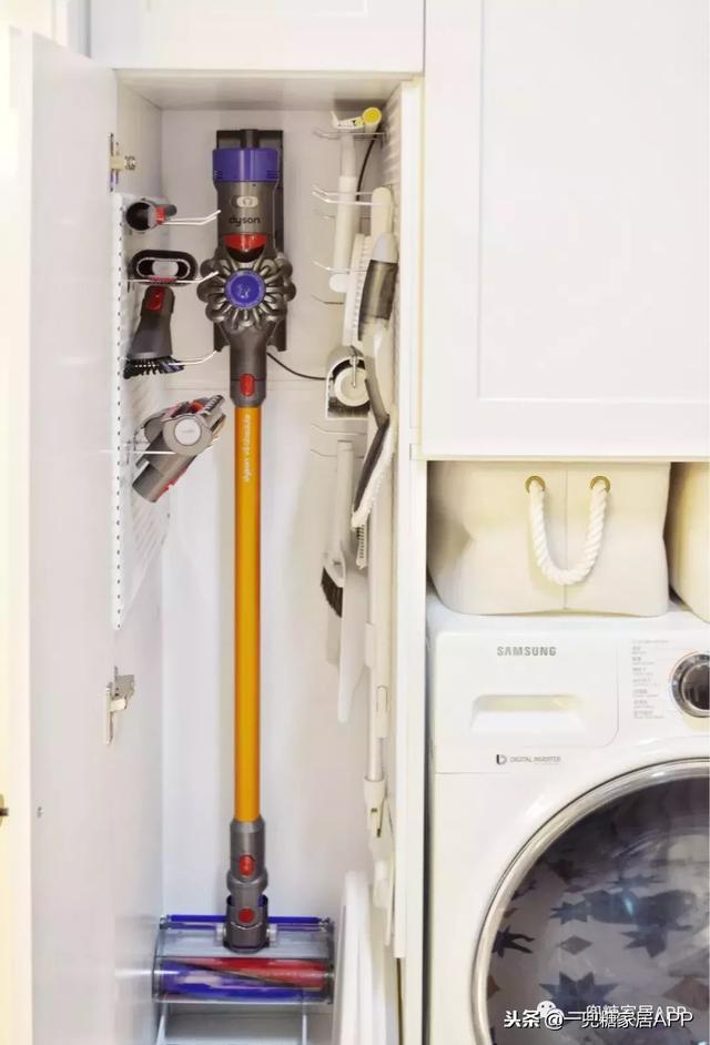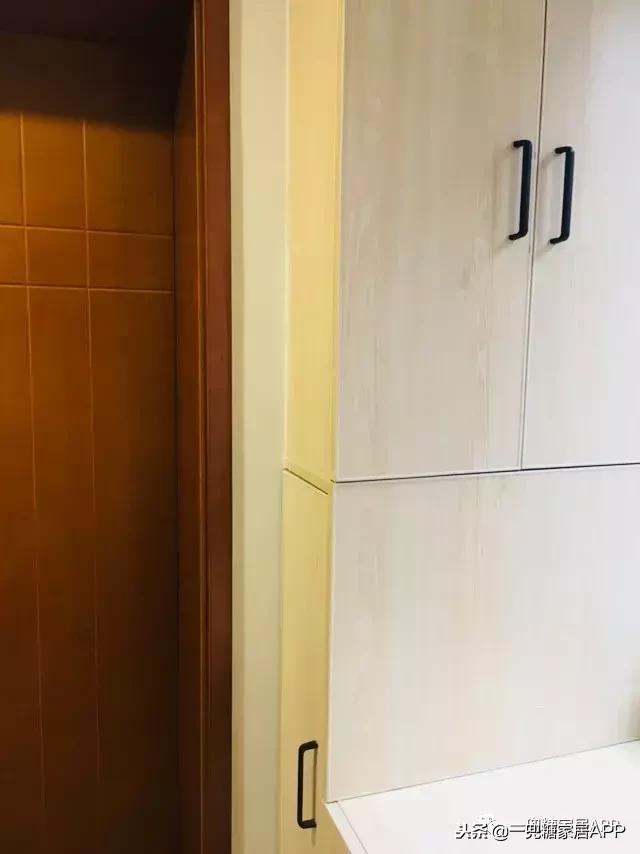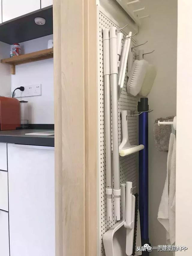▼2.在玄關裝25cm窄櫃,搭配可推拉掛桿:這個戶型的玄關比較小,留出了一個25cm的薄櫃,能夠用來收納清潔工具。櫃門在正面,方便取放工具;加上可推拉掛桿後能收納更多工具。