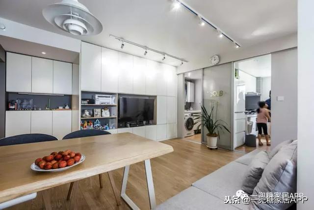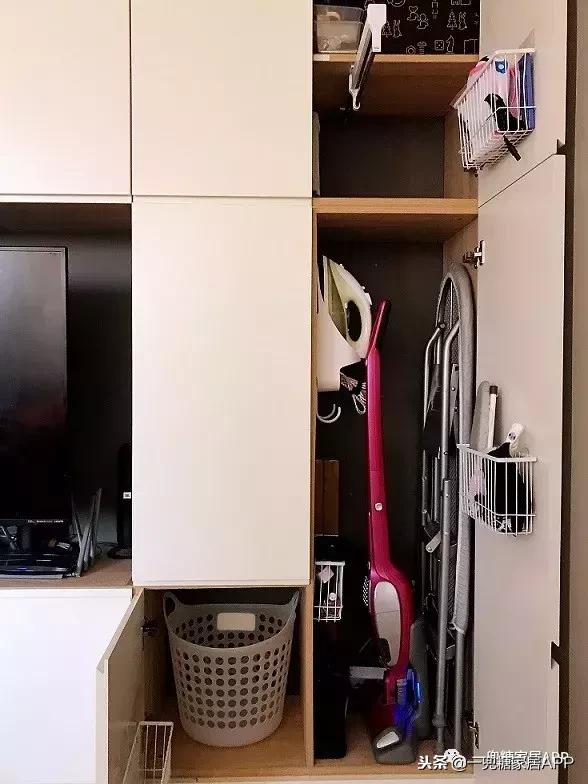 ▼1.客廳電視機旁設置收納空間:設計電視櫃時可以將裝清潔工具的空間也加上去。這個73㎡的房子是三房一廳的結構,客廳牆壁上的電視櫃是家中最重要的收納區。