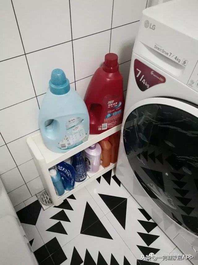 ▼洗衣機旁的縫隙放上夾縫櫃,用來收納洗滌用品。