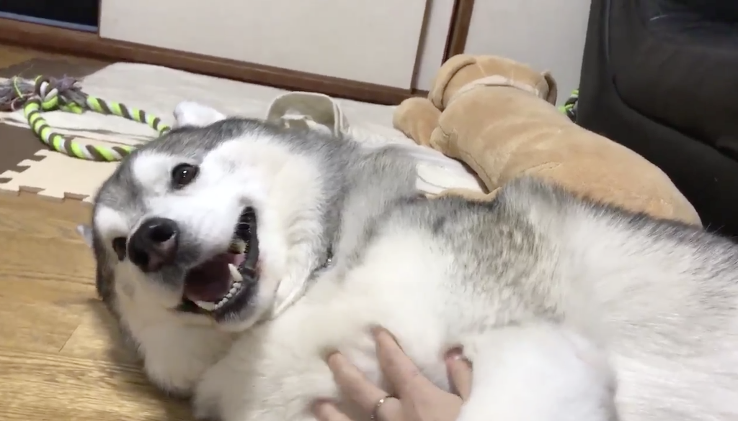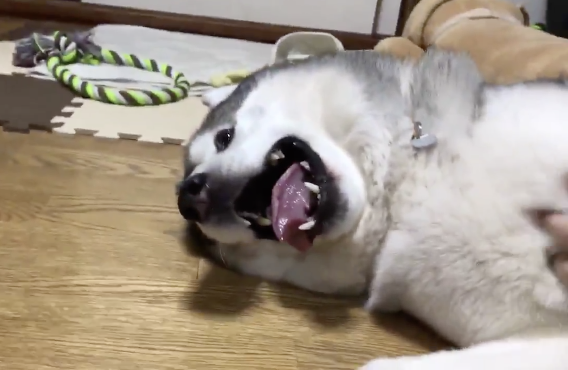 ▼那天主人給文太抓癢,牠開心笑著躺在地板上,顯然非常享受,爽到連粉嫩小舌頭都跑出來見客惹>////<。