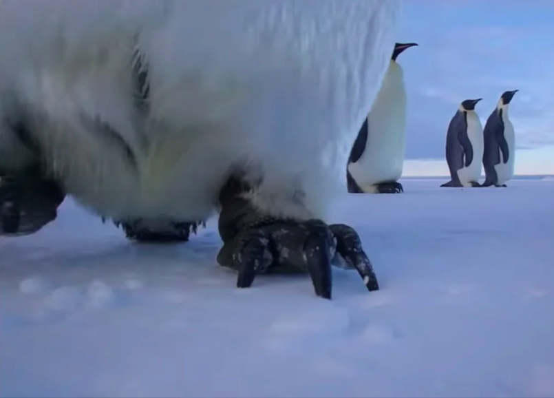 ▼Eddie將攝影機平放在冰上,本來鏡頭只能拍到企鵝們的腳丫,但牠們搖搖晃晃走過來時不小心一腳弄倒了攝影機,正好讓鏡頭對準了牠們的臉。
