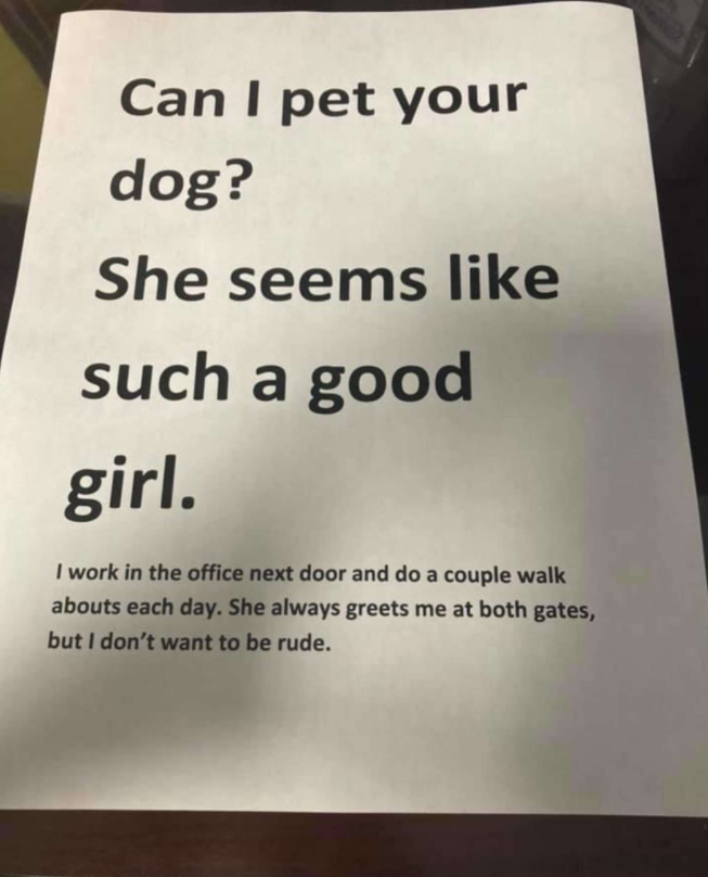 ▼有一天Sarah下班時心情不好,決定到處走走。她路過那個院子時狗狗又對她露出燦爛的笑容,她再也忍不住了,決定做些什麼:「我看到牠在院子門口對我微笑、搖尾巴,於是我回到辦公室列印了一張紙條。」她在紙條上說明自己在附近的辦公室工作,每天都會遇到這隻可愛的毛孩,狗狗看起來很乖很可愛,自己能不能摸摸牠?