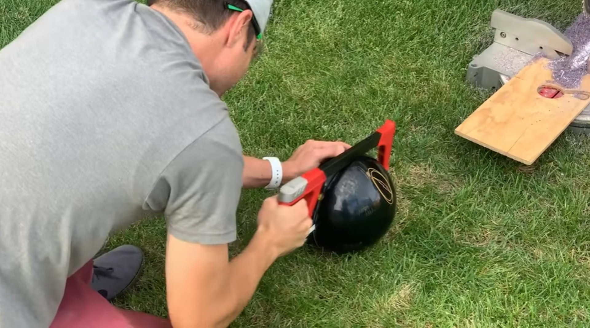 ▼球技不好沒辦法弄倒所有的球瓶,這該怎麼辦呢?Mark Rober決定用科技彌補不足。他切開保齡球,掏出內部的玻璃纖維和聚胺脂,然後把機械裝置放進去。這種機械裝置不能單獨使用,要跟貼在投球者背上的裝置配合才行。