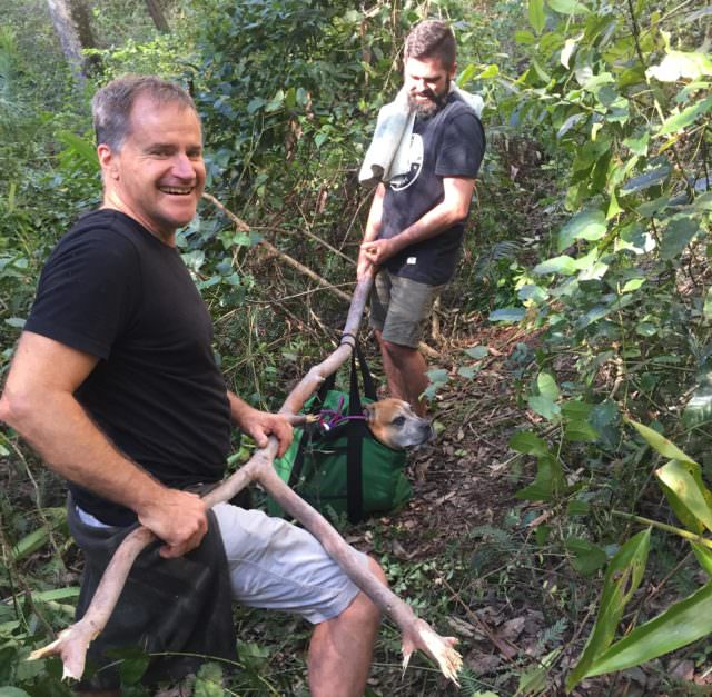 ▼他們用樹枝、大背包製作簡易擔架,讓Miss Piggy待在背包裡,然後抬著牠往前走。抬著近40公斤重的狗狗走了45分鐘,他們才終於回到車邊。