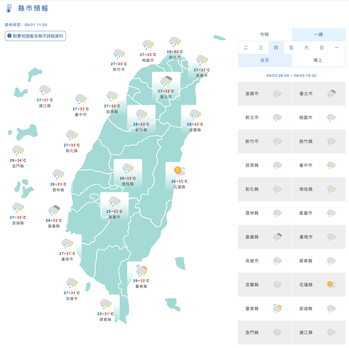 ▼根據氣象局,週三(2日)環境仍偏西南風,中南部會有短暫降雨,而其他地區則是午後雷陣雨,其中尤以山區為主,北部、東北部平地地區也有些雷雨;週四、週五(3、4日)台灣附近類似低壓帶環境,中部以北吹偏北風、東北風,南部則吹偏西南風,所以各地水氣較多;週六至下週一(5-7日)會恢復吹西南風,中南部有短暫降雨,其他地區以午後雷陣雨為主。