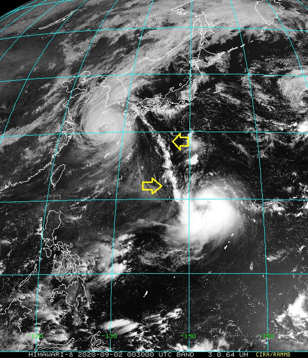 今年第9號颱風「梅莎」和第10號颱風「海神」目前位於西太平洋上,中颱梅莎已經一路北上登陸韓國。中央氣象局局長鄭明典在臉書上分享罕見衛星雲圖,表示雙颱之間的雲帶連接很清晰,代表有氣流輻合,出現了一條長長的「手牽手」的情景,指雙颱廣義上和環境有類似「反對稱的相互影響」。