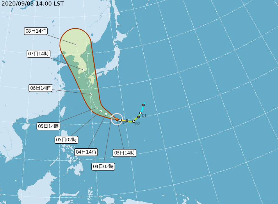▼而這樣少見的雙颱牽手照,也是證明梅莎和海神的環流很龐大,但這並不等同於「藤原效應」,因為雙颱已經相距超過2000公里以上。而目前海神颱風正以每小時15公里速度,朝西北西進行,依據中央氣象局的預測,未來行進方向也是朝韓國前進。