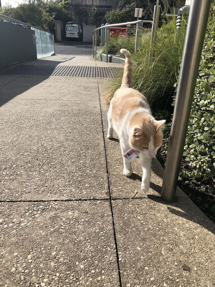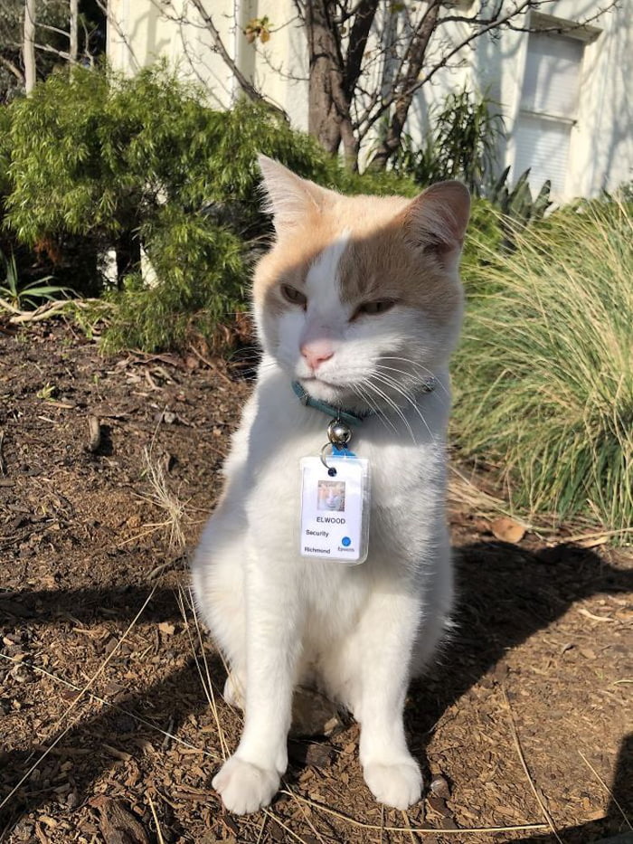 ▼這隻不怕生的橘白喵叫作Elwood,原本就常常在醫院四處走動了,每天早上還會自動自發的站在醫院門口,溫馴的讓剛來上班的員工摸摸,儼然變成一位警衛,因此醫院也就順理成章的將牠收編,並還特別給予牠一張「員工證」。