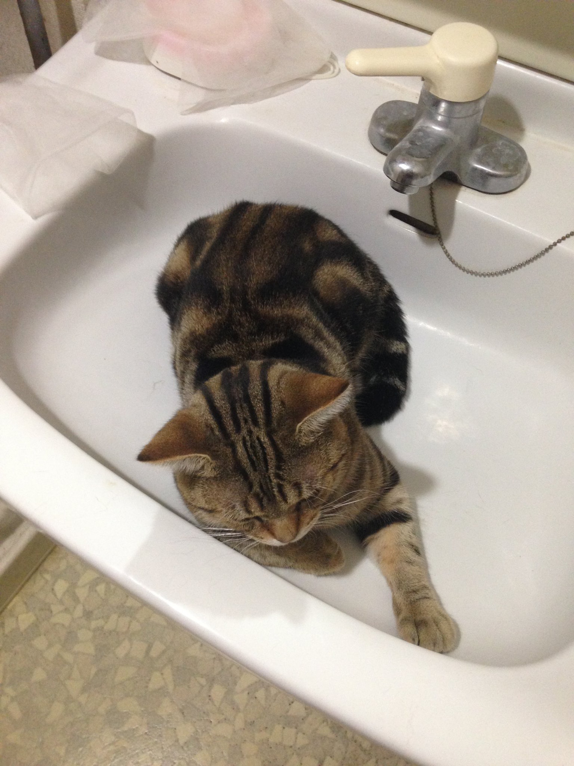 ▼如果洗手池比較大的話,就會變成貓咪浴缸的概念,躺起來比較舒爽。