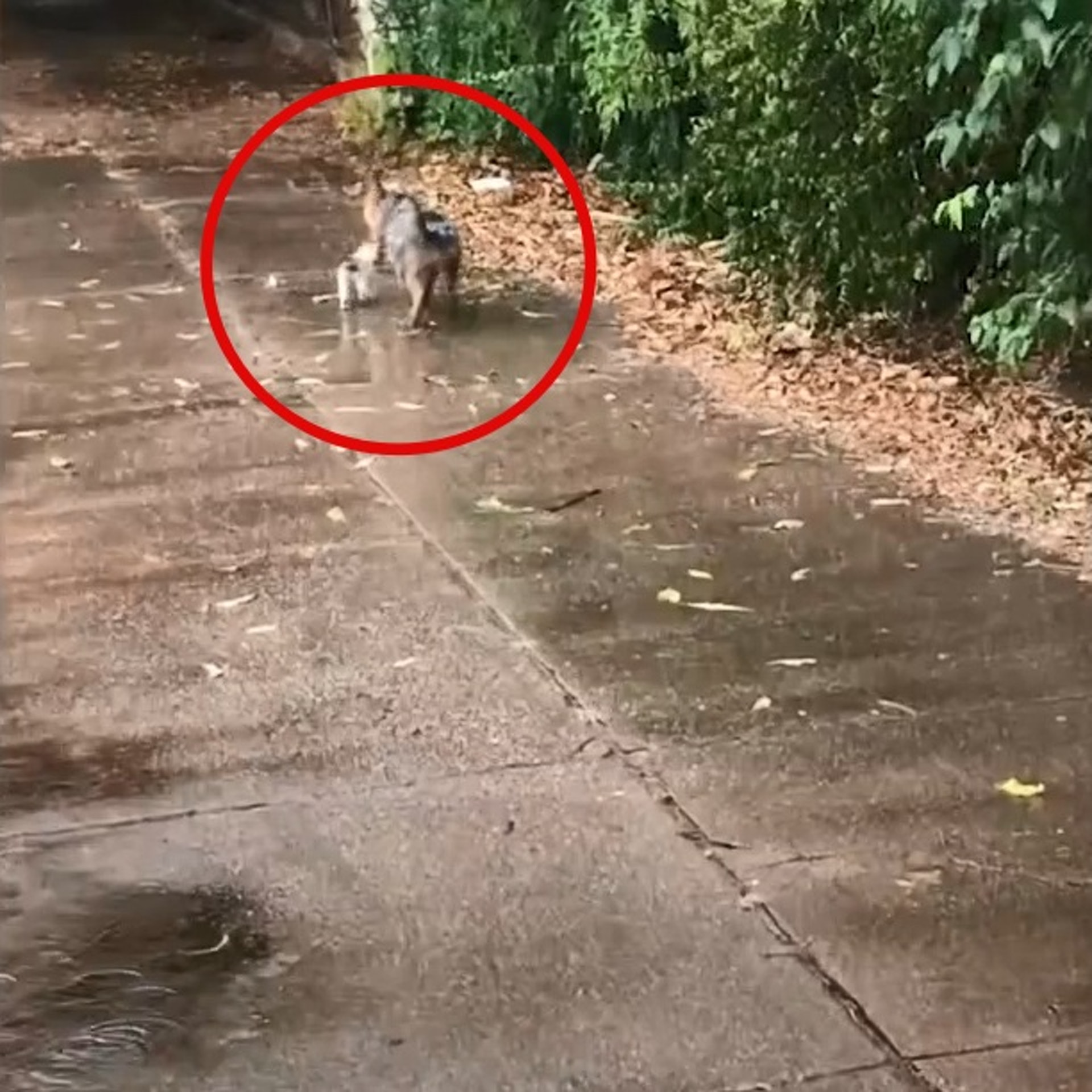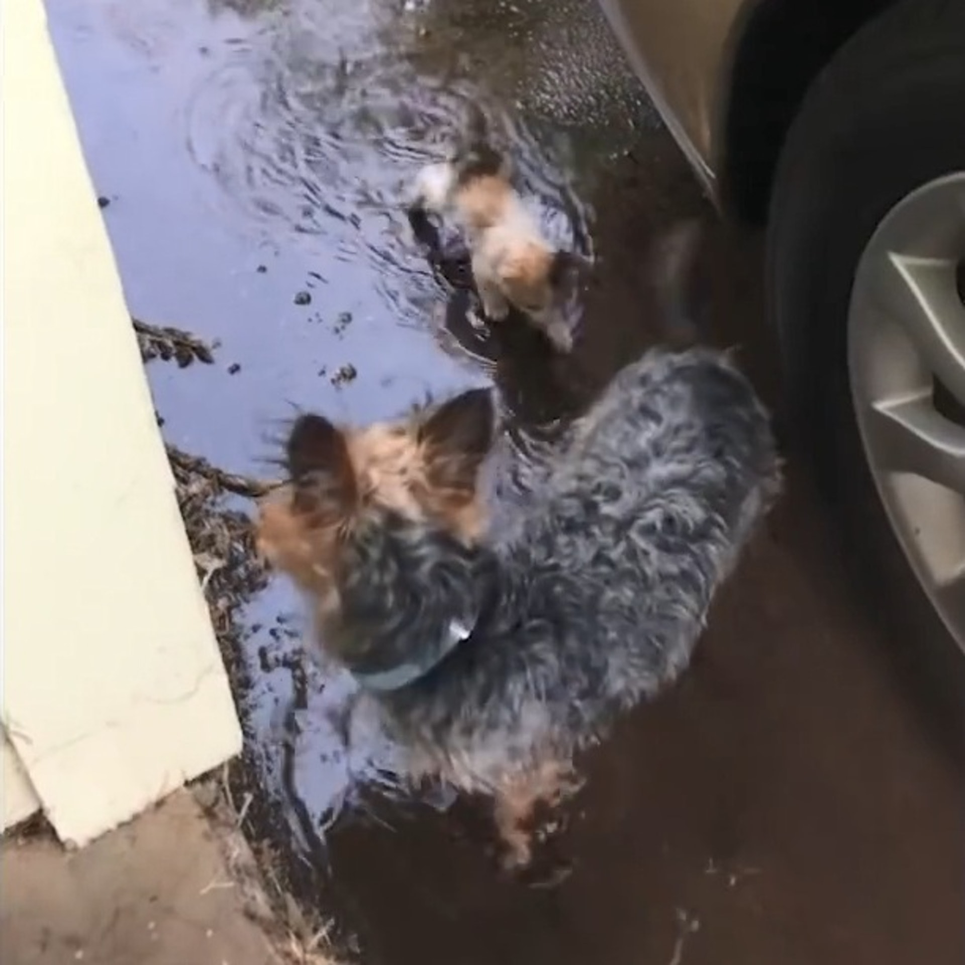 ▼遇到積水Hazel也十分有耐心地停下來等小貓跟上。