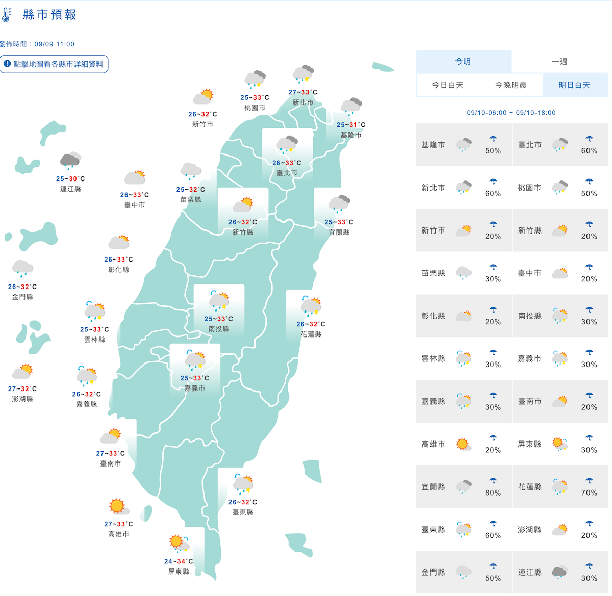 2020年09月09日時序已從夏季進入到秋季,氣溫也漸漸稍轉涼,而入秋後的首波鋒面將在9月10日(週四)報到,將會在10日、11日(週四、週五)兩天影響台灣,所以屆時天氣會變得較為不穩定些,降雨的範圍會擴大。