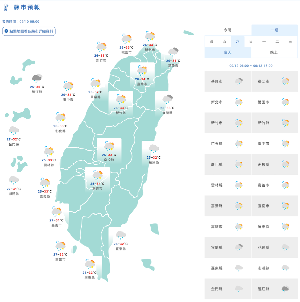 ▼本週四、週五(10日、11日)因為受到微弱鋒面雲系的影響,雖然鋒面結構鬆散,但是需注意午後短暫陣雨,尤其北部、東北部和山區,容易有可能出現較大雨勢,溫度仍是沒下雨時顯悶熱,各地高溫約32、33度,最主要影響的是週五白天,易出現較大降雨,影響持續到週五的晚上,之後鋒面就會逐漸通過往台灣東方海面。