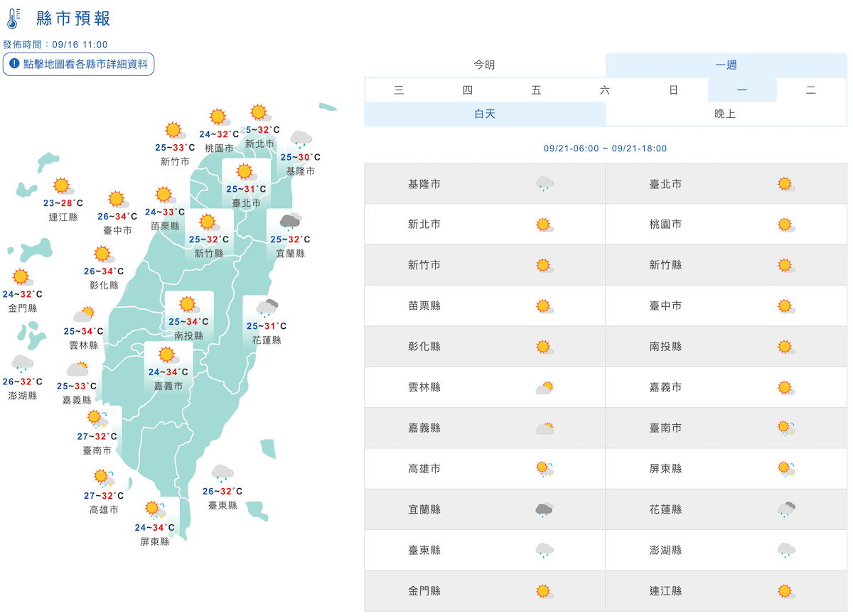▼週五(18日)起,因為鋒面接近,週日、下週一(20、21日)鋒面通過和東北風增強,北部、東半部迎風面會有局部短暫陣雨,其他地區多雲到晴,午後有局部短暫雷陣雨;北部高溫溫度約會下降3、4度,約31、32度,低溫約為24、25度。