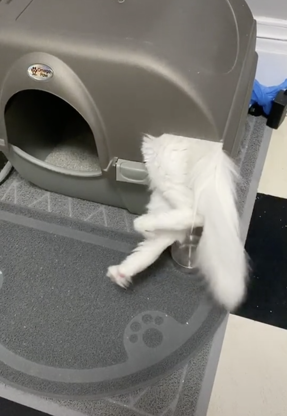 貓砂盆有門你不走!白貓硬要「滑進去」 網噴笑:這隻裡面裝哈士奇?