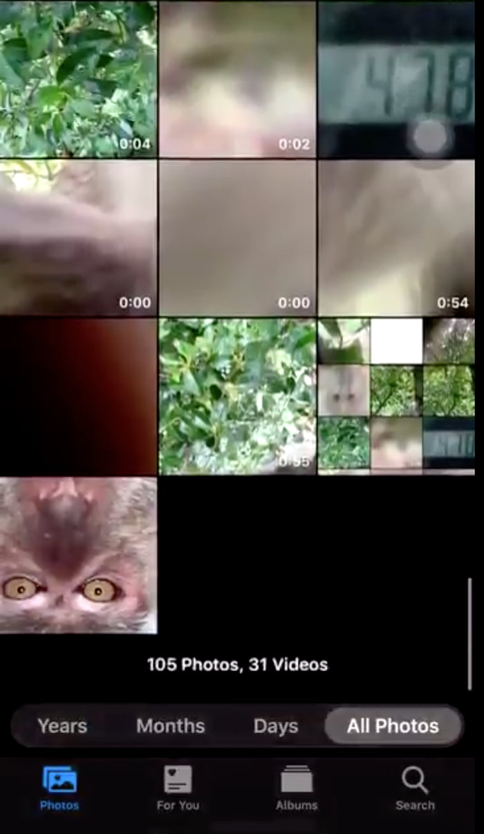 ▼原來猴子偷走了Zackrydz的手機,無意間拍了一堆樹木、植物的照片,還有好幾張自拍,包括牠把手機塞進嘴巴裡咀嚼的影片。看來猴子發現手機不能吃後,對相機產生了興趣,雖然牠不懂拍照,但把iPhone的各種攝影功能都試了一遍。