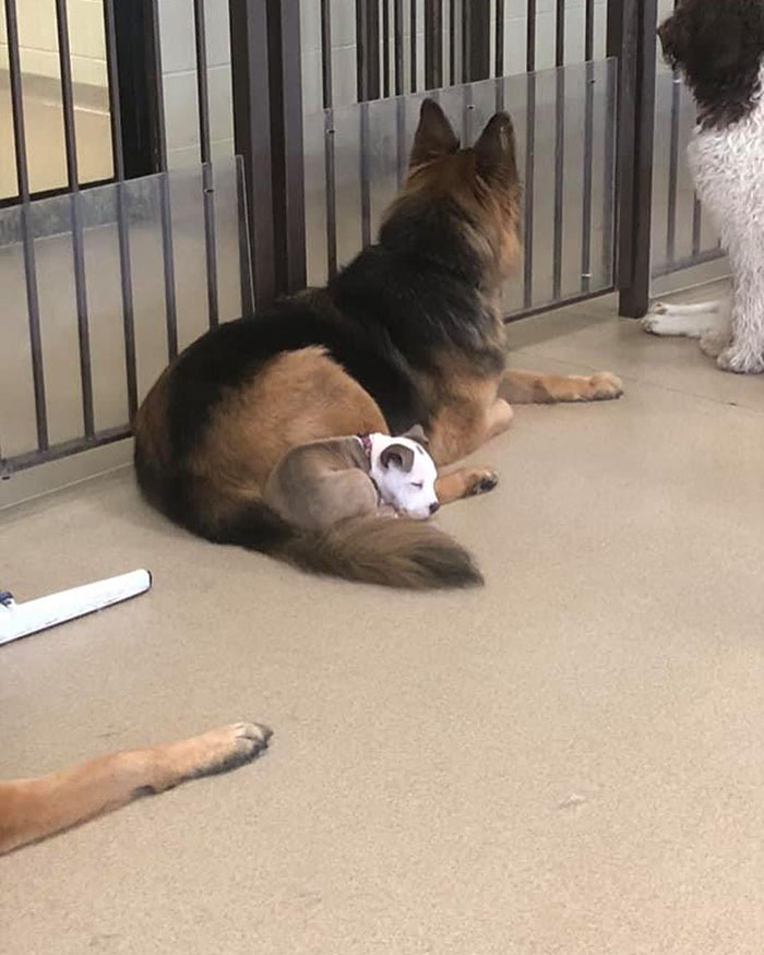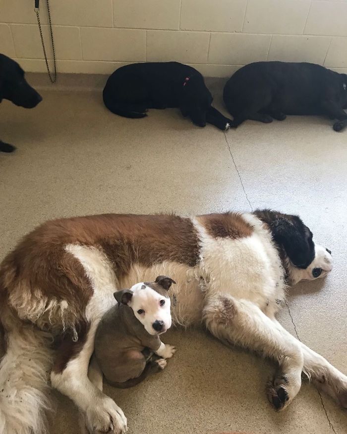 Edna已經是一隻大狗狗了,還喜歡靠在同伴身上睡覺。那些體型小巧的狗狗被牠當成枕頭,看起來就很沈重。Edna可能還以為自己是當初那個體型小巧的狗寶寶吧!