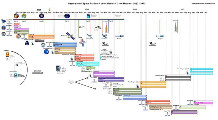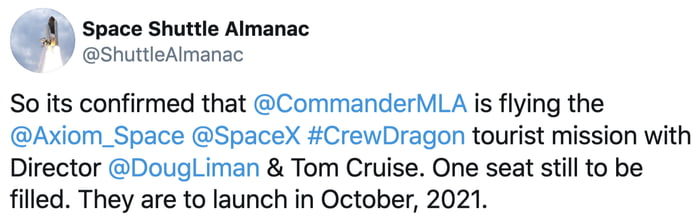 ▼專門報導太空任務新聞的「Space Shuttle Almanac」在推特上po出一張圖表,其中包括前往國際太空站的所有相關訊息。湯姆克魯斯、科幻電影《明日邊緣》的導演道格李曼(Doug Liman)的名字都在上面。這次航程由資深飛行員Michael Lopez-Alegria負責。