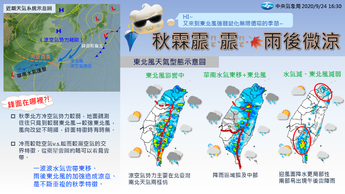 2020年09月25日氣象局報告,今天(25日)至明日(26日)的白天因為受到東北風影響,北部、東北部的氣溫稍涼,桃園以北和東半部地區有局部短暫雨,其他地區為多雲到晴,午後南部地區及中部山區有局部短暫陣雨。