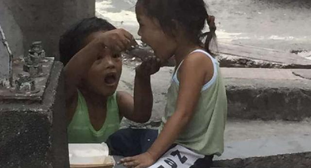 ▼當時這對情侶並沒覺得不對,還以為小男孩將食物拿回家吃了。但他們散步途中又看到了那個小男孩,他正面帶笑容給一個小女孩餵飯!原來這個小女孩是他的妹妹,這位小哥哥把自己乞討得來的食物全部餵給妹妹吃。